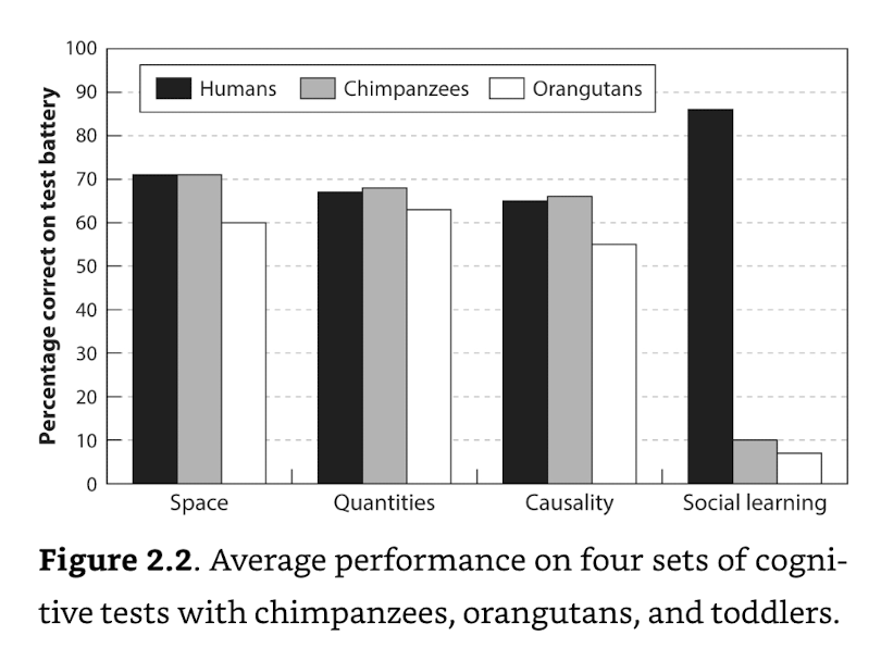 When you put toddlers (pre-cultural humans) head-to-head with chimpanzees on cognitive tests for space, quantities, and causality, the results are essentially tied. Chimps and orangutans can match us or beat us across the board — with one stunning exception.
